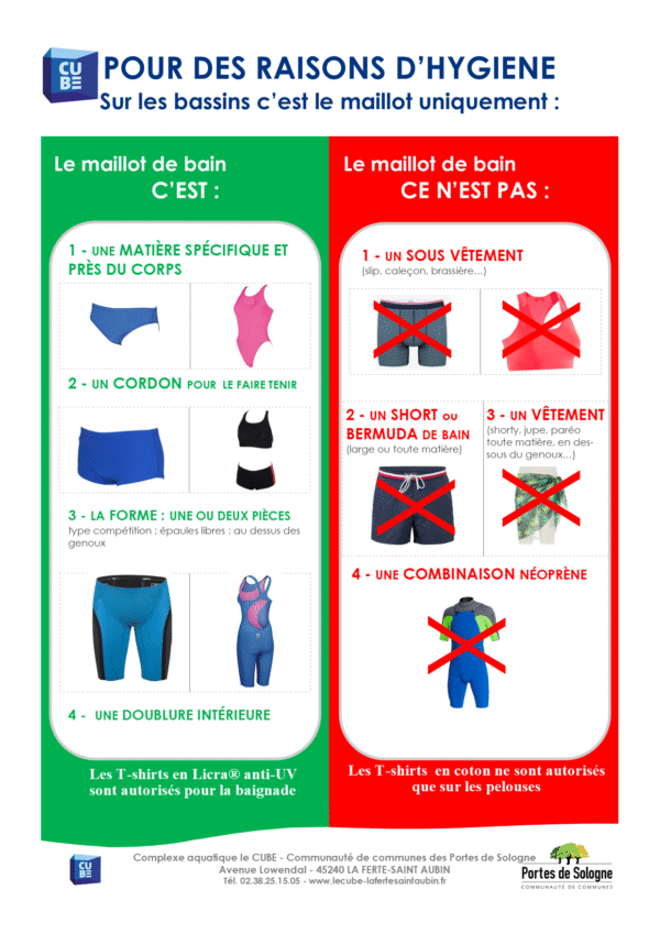 6.17 – Tous les types de maillots de bain portés à l’extérieur sont interdits. Le port du maillot de bain est obligatoire. Les bermudas, shorts, caleçons, maillots transparents, slips indécents, paréo etc… ne sont pas autorisés pour la baignade. Tout équipement de bain qui compromettrait l’efficience d’une douche est interdit.